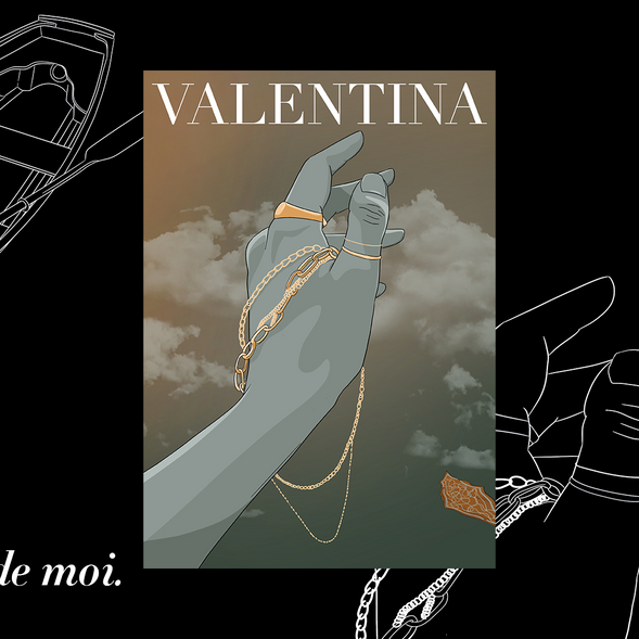 Je décide alors de tenter de créer la couverture de ce fameux magazine, présentant cette femme décrite au fil du projet. J'essaie d'y mettre les référence de l'EP, j'utilise une palette de couleurs directement inspirée de la cover du projet. Et je dessine alors Valentina, sur la cover du magazine.